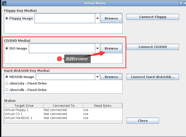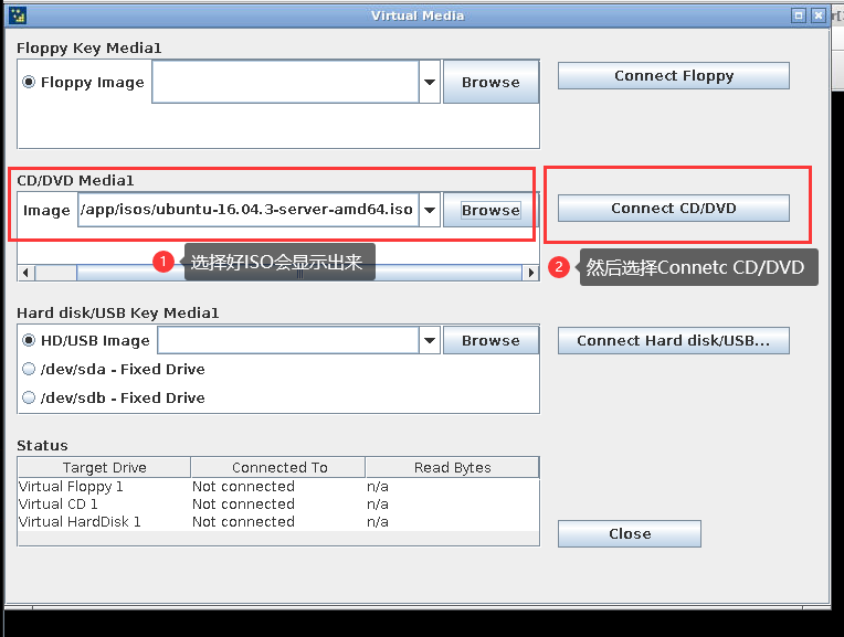 2: Select Connect CD/DVD (complete ISO mounting)